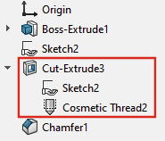 나사산 표시는 FeatureManager 디자인 트리에서 나사산을 연결하기 위해 선택한 공통 모서리를 공유하는 면의 최신 피처가 소유합니다. 아래 이미지에서는 컷 돌출을 작성하고 모따기를 추가한 후 모따기 모서리에서 나사산 표시를 추가합니다. SOLIDWORKS