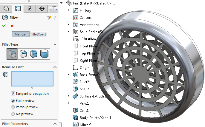 따로 순서를 변경하지 않는 한, 피처 이름은 FeatureManager 디자인 트리에서 작성한 순서대로 위에서 아래로 표시됩니다. (피처는 파트의 부품처럼 간주됩니다.)