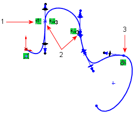 Istnieje możliwość dodawania relacji pomiędzy punktami splajnu, pomiędzy uchwytami splajnu oraz pomiędzy uchwytami splajnu a zewnętrznymi elementami szkicu. Wybory pojawiają się, kiedy w szkicu istnieje odpowiednia geometria.