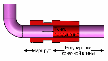(Только для трубок) Указывает значение, которое необходимо добавить к длине отрезка трубы. Можно установить регулировку конечной длины в таблице параметров, используя параметр EndLengthAdjustment@CPoint<n>. В примере ниже регулировка конечной длины добавляет дополнительный отрезок трубки для изготовителя, который используется при операции сгиба. После сгиба трубка отрезается программой в точке соединения, чтобы в конец маршрута можно было добавить соединительную часть.