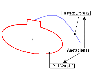 Las anotaciones le ayudan a fácilmente distinguir entre distintas entidades. Por ejemplo, estas anotaciones indican el perfil de barrido y el trayecto de barrido. Puede arrastrar dichas anotaciones para colocarlas de nuevo, pero no puede utilizarlas para cambiar las propiedades de la entidad a la que hacen referencia.