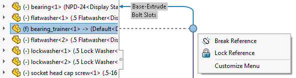 Utilice Visualización de referencias dinámicas para ver las relaciones padre/hijo entre elementos del gestor de diseño del FeatureManager. Al pasar el cursor sobre una operación con referencias en el gestor de diseño del FeatureManager, se visualizan flechas que muestran las relaciones. Se han mejorado las relaciones padre/hijo para evitar la superposición de texto y líneas. Las flechas azules muestran relaciones de operaciones padres. Las flechas moradas muestran relaciones de operaciones secundarias.
