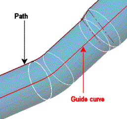 Seleccione Seguir trayecto y primera curva guía si desea que la torsión de las secciones intermedias esté determinada por el vector desde el trayecto hasta la primera curva guía. El ángulo entre el plano horizontal y el vector permanece constante en los planos de croquis de todas las secciones intermedias. Disponible cuando se seleccionan una o más curvas guía.