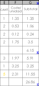 Puede rellenar la última celda de una columna de tabla con la suma de sus valores de celda precedentes. Por ejemplo, en una LDM, puede mostrar el coste total de un conjunto de elementos.