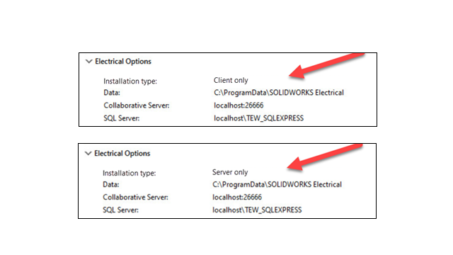 Lo anterior resulta útil para las organizaciones que comparten datos y bases de datos de SOLIDWORKS Electrical en un servidor en lugar de en equipos individuales. En este caso, los administradores instalan componentes del Servidor una vez en el servidor e instalan la opción Solo cliente en todos los equipos que ejecutan SOLIDWORKS Electrical.
