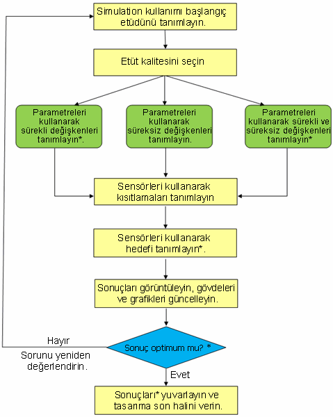 Tasarım Etütleri Gerçekleştirme İş Akışı Bu bölümde, bir Tasarım Etüdünü ayarlamak ve yürütmek için gerçekleştirilen temel işlemler açıklanmaktadır. İş Akışı Grafiği Akış grafiğinde, * sadece Optimizasyon Tasarım Etüdü için geçerlidir. İlk Simülasyon Etüdlerini Tanımlamak Simülasyon veri sensörleri kullanırken, en az bir ilk etüd oluşturursunuz. İlk etüdler optimizasyon veya yükseltme etüdlerinin temelini oluştururlar. Her yinelemede, program bu etüdleri değiştirilmiş değişkenlerle yürütür. İlk Etüdlerin Sonuçlarını Değerlendirmek Simülasyon veri sensörleri kullanırken, en az bir ilk etüd oluşturursunuz. Özellikle sınırlandırma olarak kullanmak istediğiniz miktarları incelemek faydalıdır. Bir Tasarım Etüdünün Özelliklerini Ayarlamak Değişkenleri Tanımlak Sınırlandırmaları Tanımlamak Tasarımınızın sağlaması gereken koşulları melirlemek için sınırlandırmalar tanımlayın. Sınırlandırmalar surulen global değişkenler veya kütle özellikleri, ölçümlendirmeler ve simülasyon verisi için sensörler olabilir. Hedefleri Tanımlamak Optimizasyon Tasarım etüdü için hedef işlevlerinizi belirlemek üzere hedefler tanımlayabilirsiniz. Optimizasyon Tasarım etüdü SOLIDWORKS Standard ve SOLIDWORKS Professional'da mevcut değildir. Tasarım Etüdünün Sonuçlarını Görmek Çalıştırdığınız etüdün sonuçlarını görmek için Sonuç Görünümü sekmesine tıklayın. Tasarım Etüdü Sonuçları Aşağıdaki tablolar etüd kalitesi ve değişken kombinasyonları için beklenen sonuçları özetler. Ana başlıkTasarım Etütleri Sonraki Tasarım Optimizasyonu