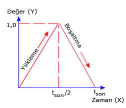 Yük çarpanı (Y değeri), 0 zaman noktasında 0'dan tbitiş/2 zaman noktasında 1'e yükselir ve ardından tbitiş zaman noktasında 0'a düşer. Burada tbitiş, doğrusal olmayan analizin bitiş zamanı ya da geçici termal analizin toplam süresidir.