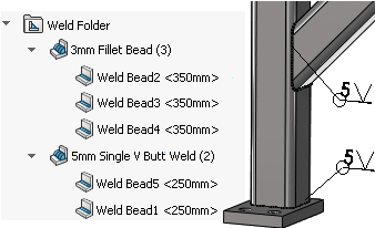 - 在 FeatureManager(特徵管理員) 設計樹狀結構中,展開熔接資料夾