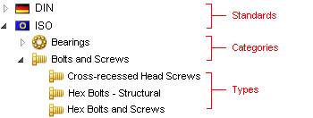 왼쪽 창의 Toolbox 규격 트리에는 규격, 카테고리, 유형과 함께 사용자가 정의한 사용자 정의 폴더 및 부품이 표시됩니다.