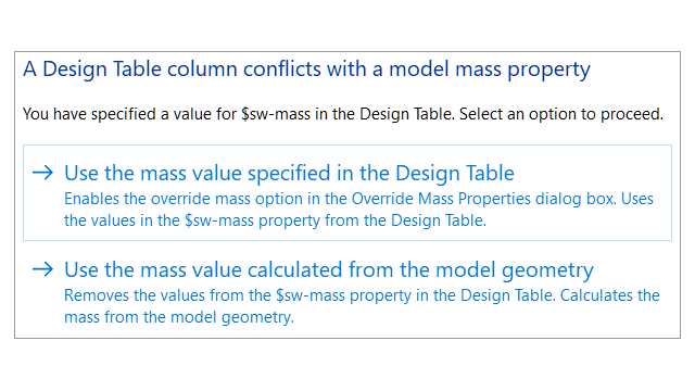 Exclui a coluna $SW-MASS ou a coluna $SW-COG que tem os valores inseridos manualmente. O modelo usa valores de massa calculados a partir da geometria do modelo. |