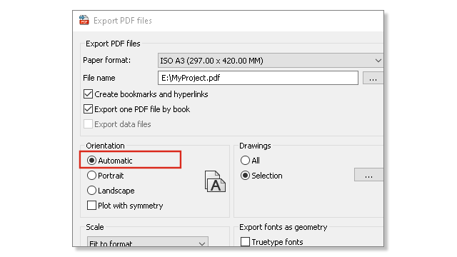 Os desenhos na orientação Paisagem são convertidos em páginas PDF na orientação Paisagem, e os desenhos na orientação Retrato são convertidos em páginas PDF na orientação Retrato.
