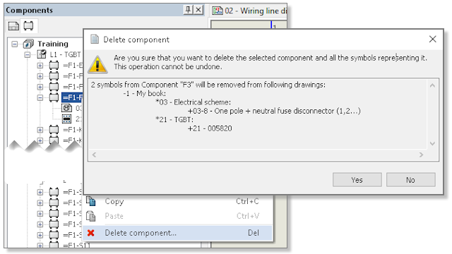 Um componente sem símbolos inseridos é excluído automaticamente. Se você quiser excluir um componente com símbolos inseridos nos desenhos, uma caixa de diálogo será aberta, permitindo que você selecione a opção para excluir todos os símbolos associados a esse componente. Se o componente estiver associado a uma peça ou montagem 3D, ele será automaticamente dissociado.