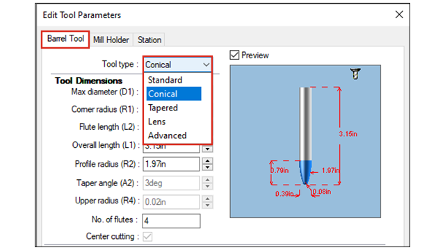 İşlem Parametreleri iletişim kutusunda, Araç sekmesi altında, varil aracı türü olarak Standart, Konik Tanjant, Açılı, Lens veya Gelişmiş öğesini seçebilirsiniz. Özel varil araçları oluşturmak için profiller de tanımlayabilirsiniz.