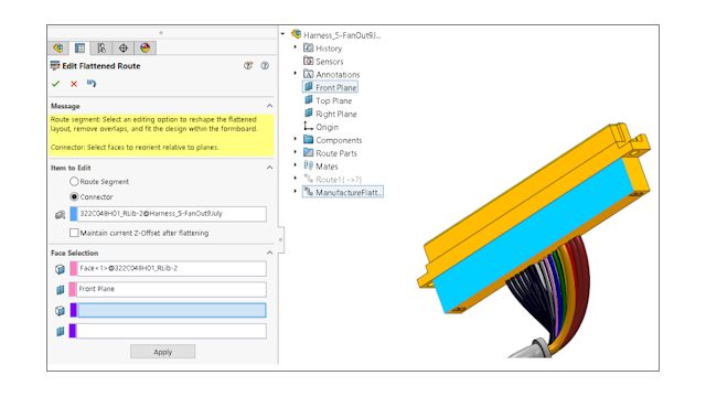 Düzleştirilmiş Tesisatlarda Bağlantı Elemanlarını Yeniden Yönlendirme Bağlantı elemanlarını, seçili bir düzleme paralel olacak şekilde yeniden yönlendirebilirsiniz. Düzleştirilmiş Tesisatı Düzenle PropertyManager'ında Yüzler ve Düzlemler alanında bir düzlem seçin. Bu, 3B Oryantasyonu Koru işlemini etkilemez. Ana başlıkTesisat Routing Library Manager Geliştirmeleri Karmaşık Splice'lar Bir Kablo Demeti Kesitinin Kesitini Görüntüleme Tesisat Yassılaştırma İyileştirmeleri