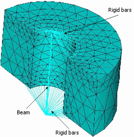 如同松散套合螺栓,Simulation 为紧密套合螺栓生成刚性杆单元。此外,Simulation 在横粱节点和与螺栓柄相触的圆柱曲面节点之间生成刚性杆单元。