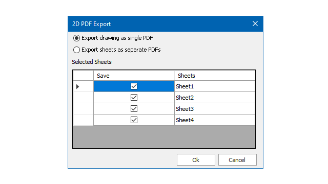 - 所选图纸。指定要在 .pdf 文件中保存的工程图图纸。