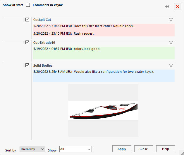 您可以採用 Post-it® 註解的方式,為 FeatureManager(特徵管理員) 中的項次 (組合件、零組件、特徵和草圖) 加入文字備註。您可以將字型樣式套用至文字、指定背景色彩、加入時間壓印,以及插入影像或螢幕擷取畫面。您可以按一下開始時顯示,下次開啟檔案時,自動在檢視所有備註對話方塊中開啟備註。