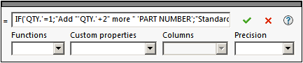 6. 輸入字串及欄表頭來完成計算的定義,使其看起來如下:IF('QTY.'=1;"Add "'QTY.'+2" more " 'PART NUMBER';"Standard")
