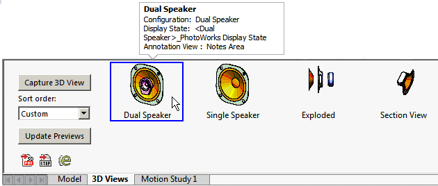 When you capture a 3D view, the view name and a preview are added to the 3D Views tab. To see the details of a view, hover over its preview. To switch views, double-click a view. The view is outlined and the display in the graphics area changes to the selected view.