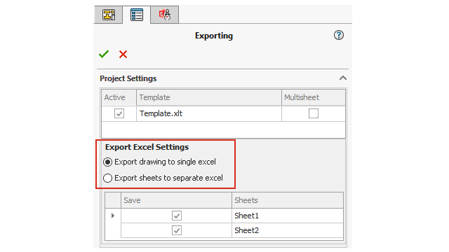 PropertyManager, under Excel Export Settings, specify
