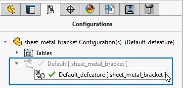 Vous ne pouvez pas configurer une configuration réduite dérivée. Le logiciel vous en empêche dans toutes les zones où vous pouvez configurer des pièces telles que les PropertyManagers, les propriétés personnalisées, les tables de configuration, les familles de pièces, etc.