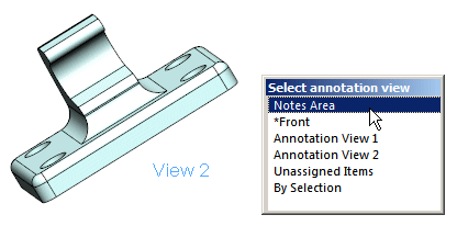 Vous pouvez affecter et réaffecter une vue d'annotation d'une cote ou d'une annotation dans les pièces et les assemblages avec une boîte de dialogue à l'écran dans la zone graphique.