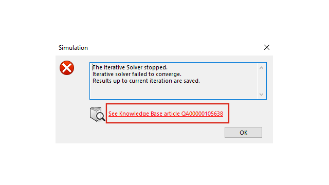 Les liens hypertexte renvoyant aux articles de la base de connaissances qui figurent dans les messages d'erreur du solveur de simulation vous dirigent vers les articles de questions/réponses du portail de connaissances de Dassault Systèmes.