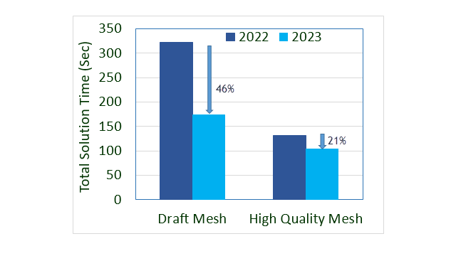 Le transfert des données de rigidité pour résoudre les systèmes d'équations est optimisé pour les études statiques linéaires et les études de fréquence et de flambage, car le traitement basé sur fichier est remplacé par le traitement basé sur fonction. Les performances de la solution sont améliorées pour les études de fréquence et de flambage. L'image illustre les performances de la solution pour une étude de fréquence type.
