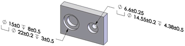 In „DimXpert Größenbemaßung“ unterstützte Funktionen Feature Beispiel und Bemaßungsart Aufsatz Durchmesser Fase Winkel-Abstand Abstand-Abstand DimXpert bemaßt SOLIDWORKS Fasen mit der Methode, die zu ihrer Definition verwendet wurde. Fasen, die anhand ihrer Topologie erkannt werden, werden mit Abstand-Abstand bemaßt. Kegel Eine Reihe externer oder interner Kegel muss denselben eingeschlossenen Winkel haben oder auf einer gemeinsamen Ebene liegen. Zylinder Radius Feature Beispiel und Bemaßungsart Verrundung Radius Kreis überschneiden Ein Kreis, der durch den Schnitt eines Kegels mit einer Ebene entsteht. Der Kegel muss senkrecht zur Ebene sein und kann nicht von einer Ellipse erstellt werden. Der Kegel und die Ebene können durch eine Verrundung oder Fase unterbrochen sein. Stirnsenkungsbohrung Bohrungsdurchmesser und -tiefe (bei Endbedingung „Blind“) Stirnsenkungsdurchmesser und Tiefe Formsenkungsbohrung Bohrungsdurchmesser und -tiefe (bei Endbedingung „Blind“) Formsenkungsdurchmesser und Winkel Feature Beispiel und Bemaßungsart Einfache Bohrung Durchmesser und Tiefe (bei Endbedingung „Blind“) oder Gewindebezeichnung und -tiefe (bei Endbedingung „Blind“) Kerbe Länge, Breite und Tiefe (bei Endbedingung „Blind“) Die Bemaßungsart muss im Dialogfeld DimXpert Optionen angegeben werden. Breite Breite Feature Beispiel und Bemaßungsart Kugel Übergeordnetes ThemaDimXpert Größenbemaßung Verwenden von „DimXpert Größenbemaßung“