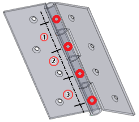Ad esempio, per una definizione a perno singolo che collega quattro cilindri di una piastra incernierata, come mostrato di seguito, il solutore calcola ed elenca le forze del perno nei quattro giunti del perno (nell'ordine dal primo all'ultimo giunto). Ogni giunto del perno è collocato nel centroide di ogni faccia cilindrica collegata a un perno.