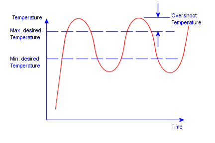 Se il termostato funziona correttamente, il grafico del rapporto temperatura/tempo nel punto del termostato deve oscillare come illustrato nella figura, sempre che si utilizzi un tempo di soluzione adeguato. Se la temperatura di sconfinamento su uno o entrambi i limiti è eccessiva, modificare le proprietà dello studio per utilizzare un passo temporale più piccolo e ripetere lo studio.