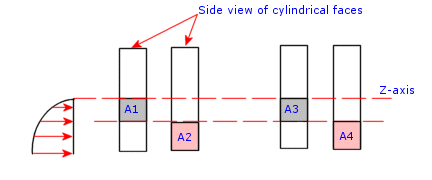 Una forza di precarico viene applicata alle facce cilindriche selezionate come schematicamente mostrato nella figura. Tenere presente che la forza di precarico viene applicata normale alla faccia e che è possibile selezionare anche i bordi di shell circolari. Supporre che l'area selezionata A1=A2 e A3=A4. A2 riceve più forza a causa della posizione di massima intensità nello spazio intermedio. Allo stesso modo, A4 prende più forza rispetto a A3. Il rapporto delle forze ricevute da A1 e A3 è direttamente proporzionale alle aree visto che occupano le stesse posizioni relative nello spazio intermedio. La stessa cosa si può dire per A2 e A4.