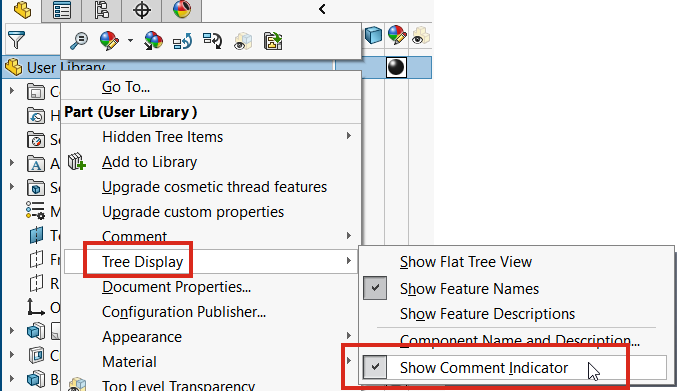 フォルダが FeatureManager デザイン ツリー内に作成されます。コメントは、コメント(Comments)フォルダ内でツールチップに表示され、さらに FeatureManager デザイン ツリーのアイテムに対してもツールチップに表示されます。