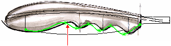 自由形状フィーチャーのベースにするために、参照スケッチカーブか、スケッチ図を持つのは便利であるでしょう。 図は、スケッチ図から、参照スケッチカーブが作られたことを示します。