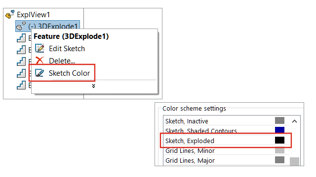 分解ラインの色の指定 システム オプションを使用して、分解の色を指定できます。分解図の分解ラインの色を変更できます。 分解ラインの色を指定するには: オプション(Options) > システム オプション(System Options) > 色(Colors)をクリックします。 色スキーム設定(Color scheme settings)のスケッチ、分解(Sketch, Exploded)を選択します。 分解図のスケッチの色を変更するには: 分解図を含むモデルを開きます。 ConfigurationManager タブで、 をクリックして分解図(Exploded View) を展開します。 3D 分解(3DExplode)を右クリックし、スケッチ色(Sketch Color)をクリックします。 スケッチ/カーブの色(Sketch/Curve Color)PropertyManager で色を選択します。 親トピックアセンブリ