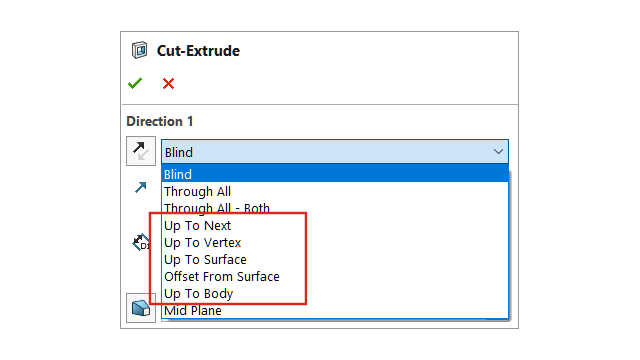 アセンブリ内のカット フィーチャーで使用可能な押し出し状態が増えました。
