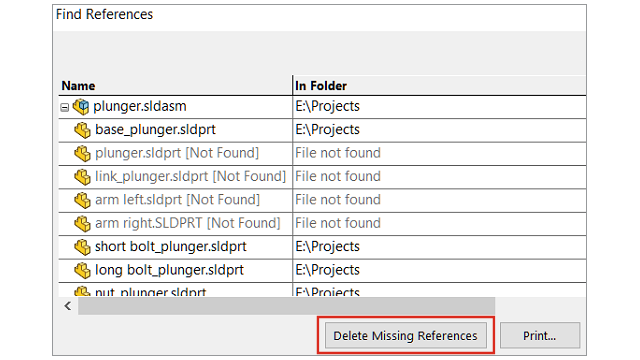 参照先検索(Find References)ダイアログ ボックスで、モデルから欠落しているすべての構成部品を削除できます。