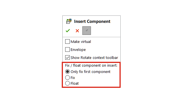 構成部品の挿入(Insert Component) PropertyManager で、構成部品の位置を最初の構成部品のみ固定(Only fix first component)、固定(Fix)、またはフロート(Float)に指定できます。