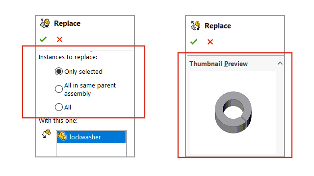 置き換え(Replace)PropertyManager で置換構成部品をプレビューできます。置き換える範囲を指定できます。