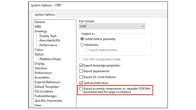 で、アセンブリ構成部品を別の STEP ファイルとしてエクスポート(大規模アセンブリに推奨)(Export assembly components as separate STEP files (recommended for large assemblies) を選択します。このオプションは、アセンブリをアトミックな STEP ファイルとしてエクスポートします。アセンブリ内の各構成部品に対して個別の STEP ファイルが作成されます。