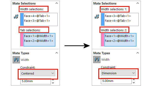 合致(Mates) PropertyManager では、幅合致オプションの幅の選択(Width selections)とタブ選択(Tab selections)の名前が幅選択 1(Width selections 1)と幅選択 2(Width selections 2)に変更されました。