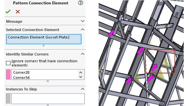 結合要素を挿入できる類似コーナーをリストします。 コーナーを右クリックし、インスタンスをスキップ(Skip Instance)を選択して結合要素を除外できます。