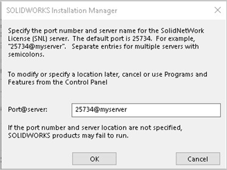Ao instalar o software cliente SOLIDWORKS em um computador, especifique um número de série de licença SolidNetWork. O Gerenciador de Instalação do SOLIDWORKS identifica esse computador como um cliente de licença SolidNetWork e solicita o nome do computador e o número da porta do Servidor do SolidNetWork License Manager. Ele exibirá um erro se o Servidor do SolidNetWork License Manager não estiver instalado ou se o nome ou o número da porta estiver incorreto.