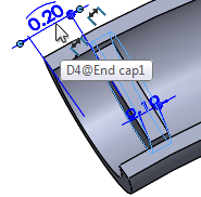 As dimensões de inserção são adicionadas automaticamente para a primeira tampa de extremidade do recurso de tampa de extremidade. Se você colocar a tampa de extremidade em um componente reto, o software atribui uma dimensão linear. Se você colocá-la em um componente curvo, a dimensão atribuída é um comprimento de arco.