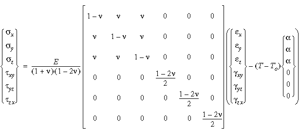 A forma mais geral de relações isotrópicas de tensão-deformação, incluindo efeitos térmicos, é mostrada abaixo: