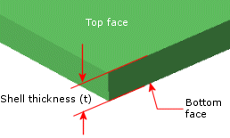 Por padrão, o programa atribui uma espessura zero. É possível modificar a espessura da casca no PropertyManager de Definição de casca. Também é possível optar entre as fórmulas de casca fina e de casca grossa.
