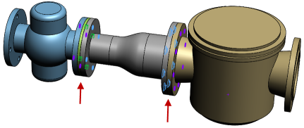 - Os corpos selecionados que compõem o submodelo não podem compartilhar conectores com corpos não selecionados. Por exemplo, a montagem de tubulação rígida abaixo não é um modelo pai adequado. Um submodelo de duas peças é conectado à terceira peça excluída com parafusos.
