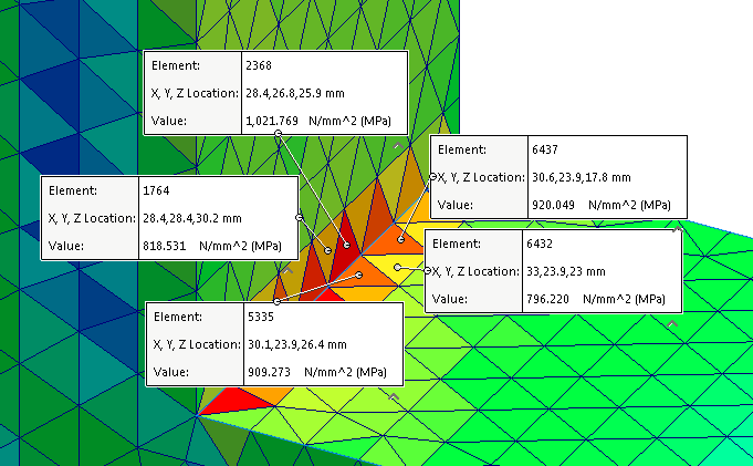 Nem todos os pontos de tensão estão associados às singularidades de tensão. Refinar localmente a malha nas regiões de tensão pode eliminar esses pontos de tensão atribuídos às concentrações de tensão que são não singulares.