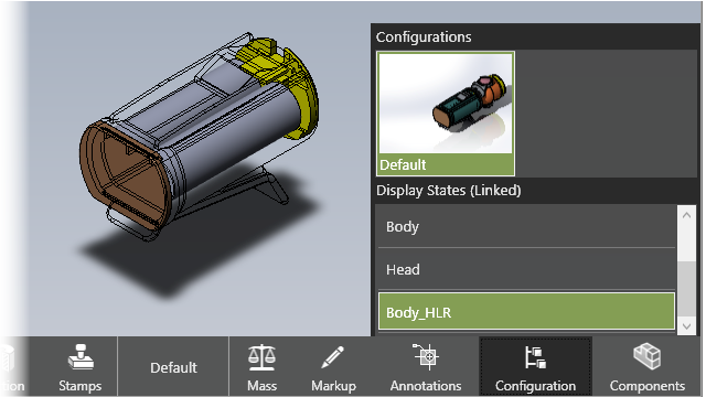 На панели Конфигурация параметр Связать состояния отображения с конфигурациями удален. Состояния отображения связываются или не связываются на основе настроек сборки SOLIDWORKS при публикации файла сборки eDrawings из SOLIDWORKS. Когда состояния отображения связываются с конфигурацией, публикуются только состояния отображения, связанные с выбранными конфигурациями. Если состояния отображения связаны с конфигурациями, в заголовке отображается сообщение Состояния отображения (связанные).