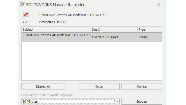 SOLIDWORKS Manage Reminder сохраняет время последнего переноса задачи.